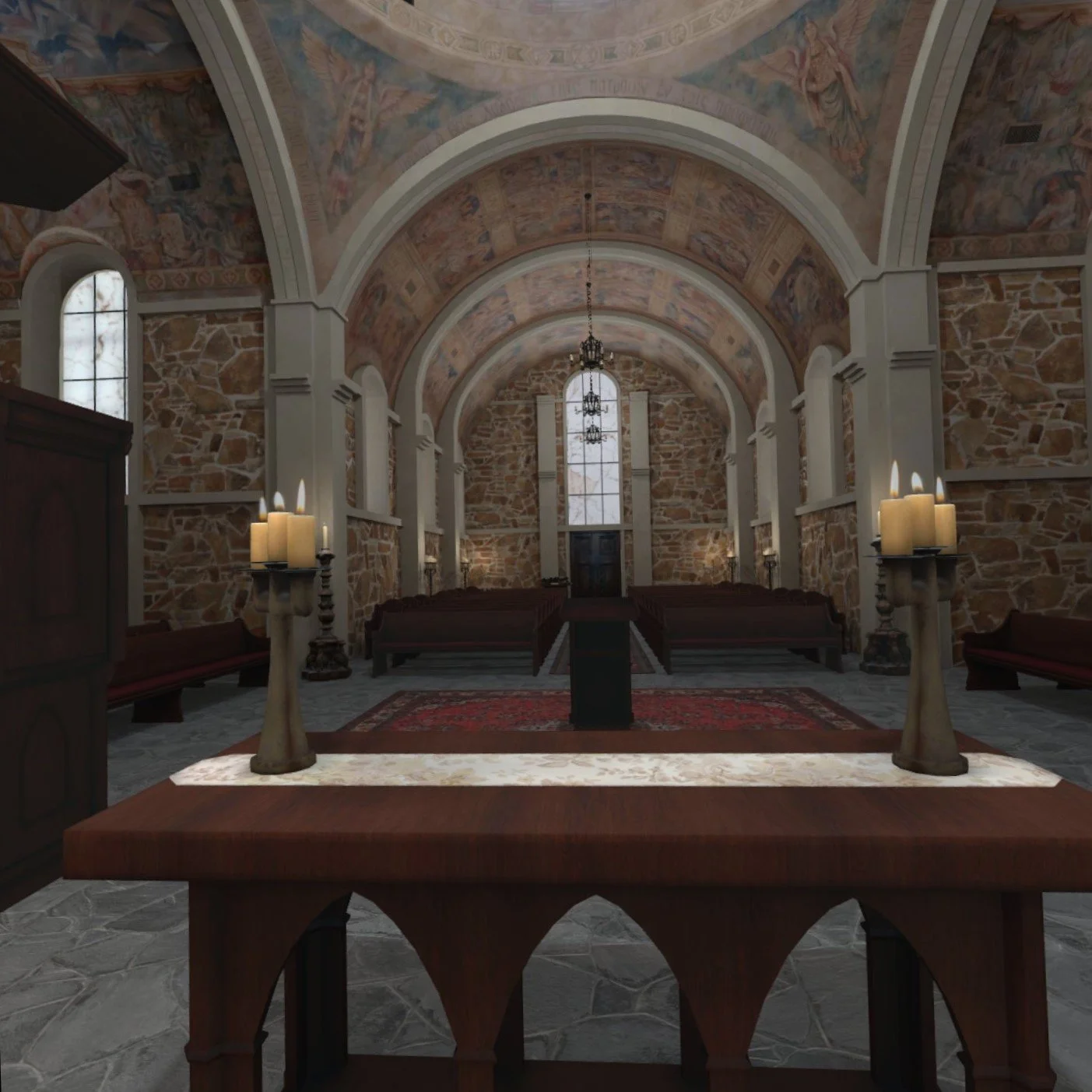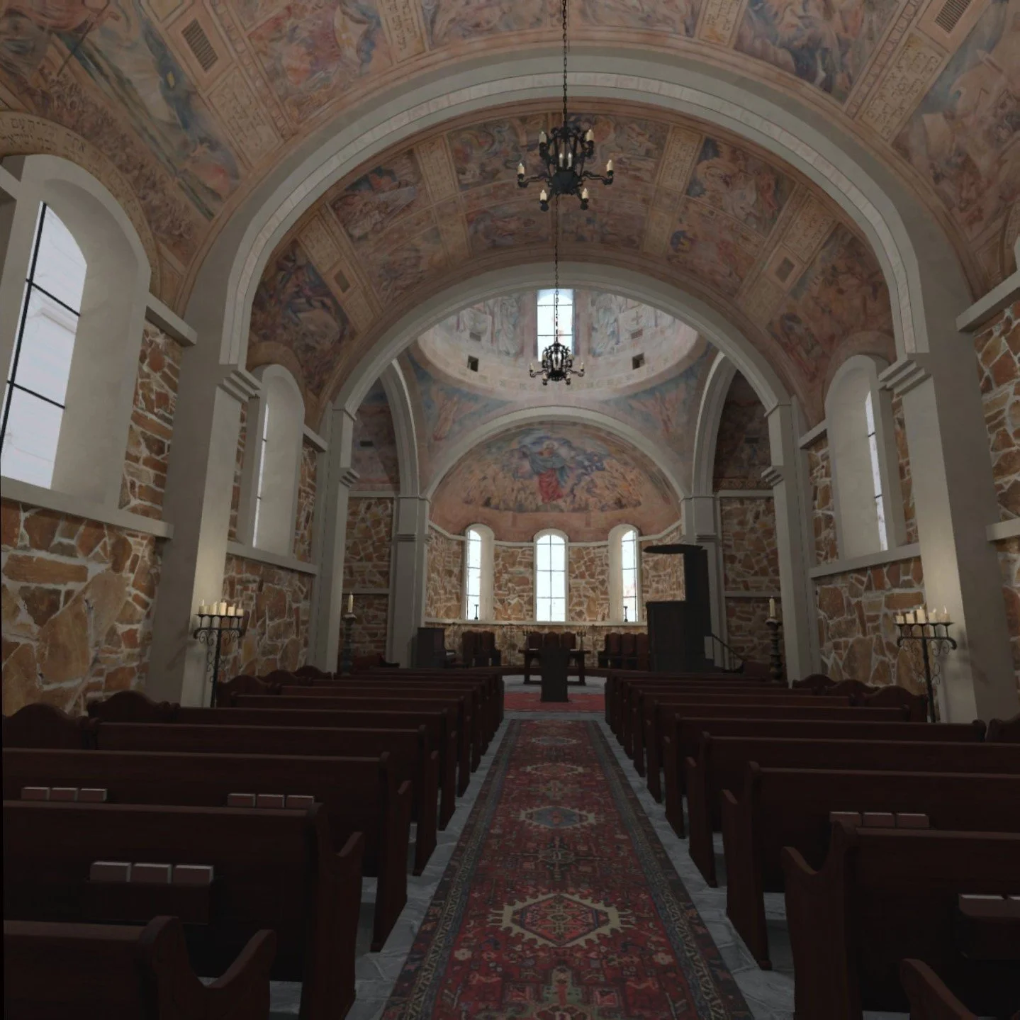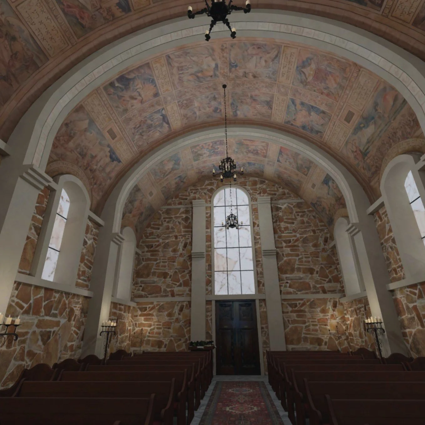 Visitors to this Virtual Chapel will wander through the space experiencing the calm and quiet of the actual building, while marveling at the artwork of Texas artist Richard McCluskey on the walls and ceiling.