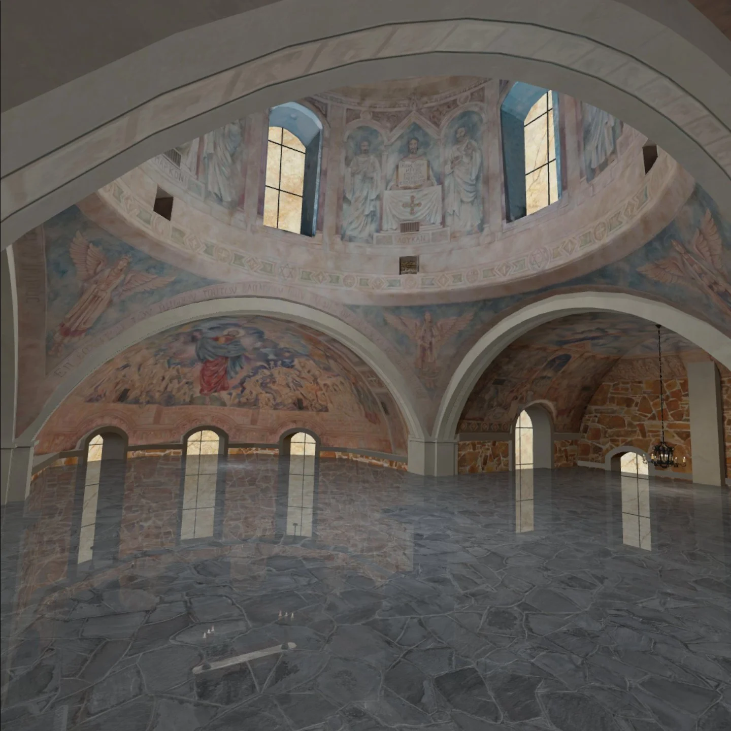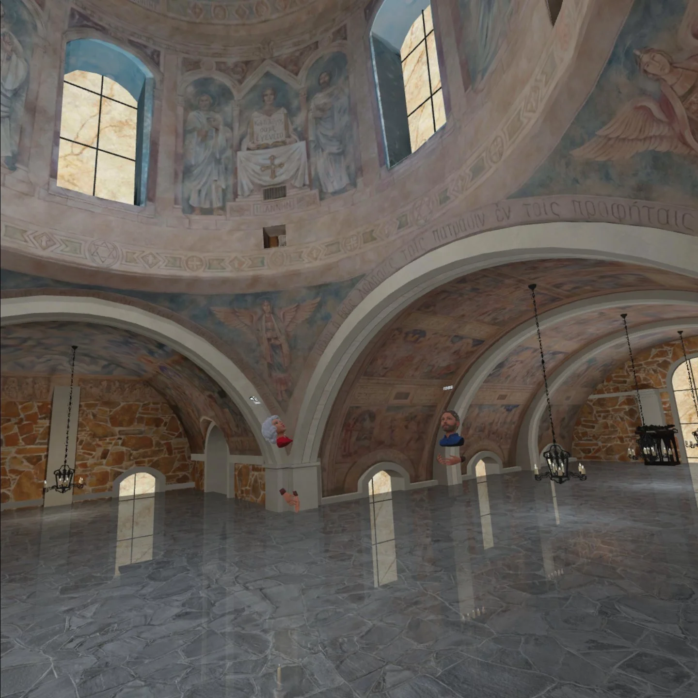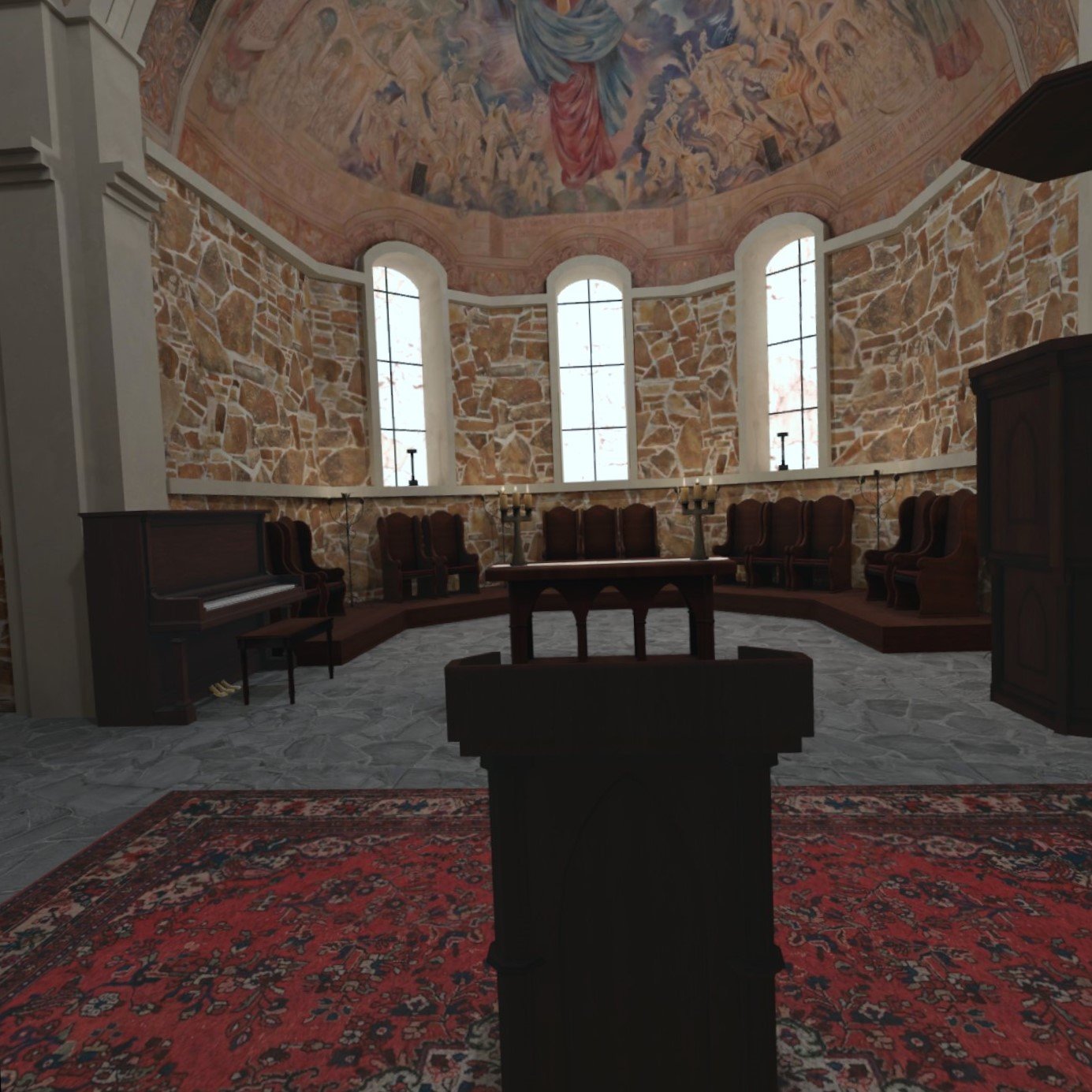 Visitors to this Virtual Chapel will wander through the space experiencing the calm and quiet of the actual building, while marveling at the artwork of Texas artist Richard McCluskey on the walls and ceiling.